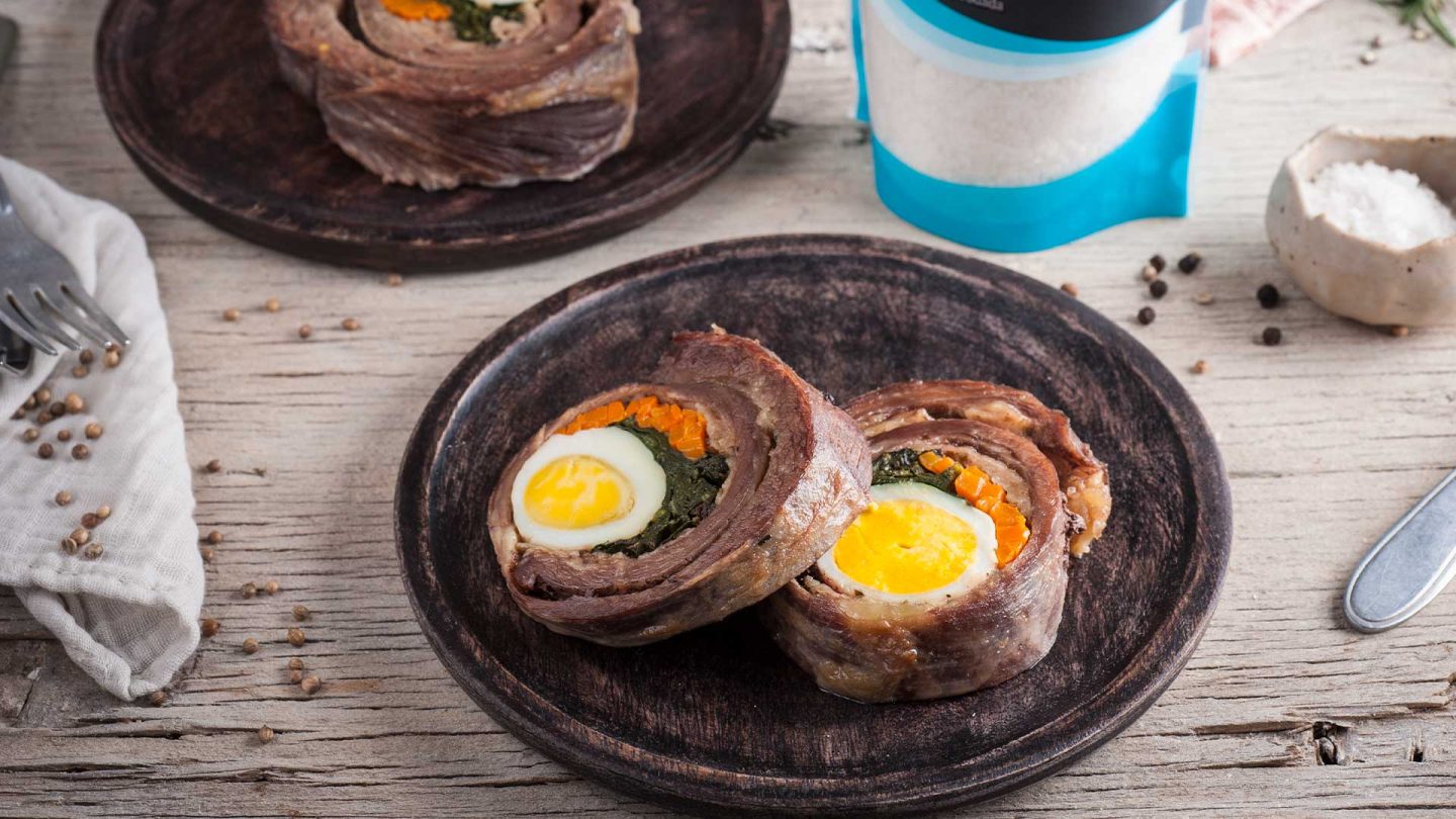 Para el relleno, tenemos que dejar 2 dedos aprox. despejados sin relleno, ponemos en una fila los huevos duros cortados por mitades, las zanahorias las ponemos en bastones y al final las hojas de espinacas (ambas frescas y crudas), debe quedar un espacio en la malaya sin relleno. Sobre el relleno agregamos pimienta y empezamos a enrollar desde el lado de los huevos para ir empujando hacia adentro el relleno, tendremos que formar un rollo que tenemos que apretar con pita de cocina y envolvemos con film plástico.