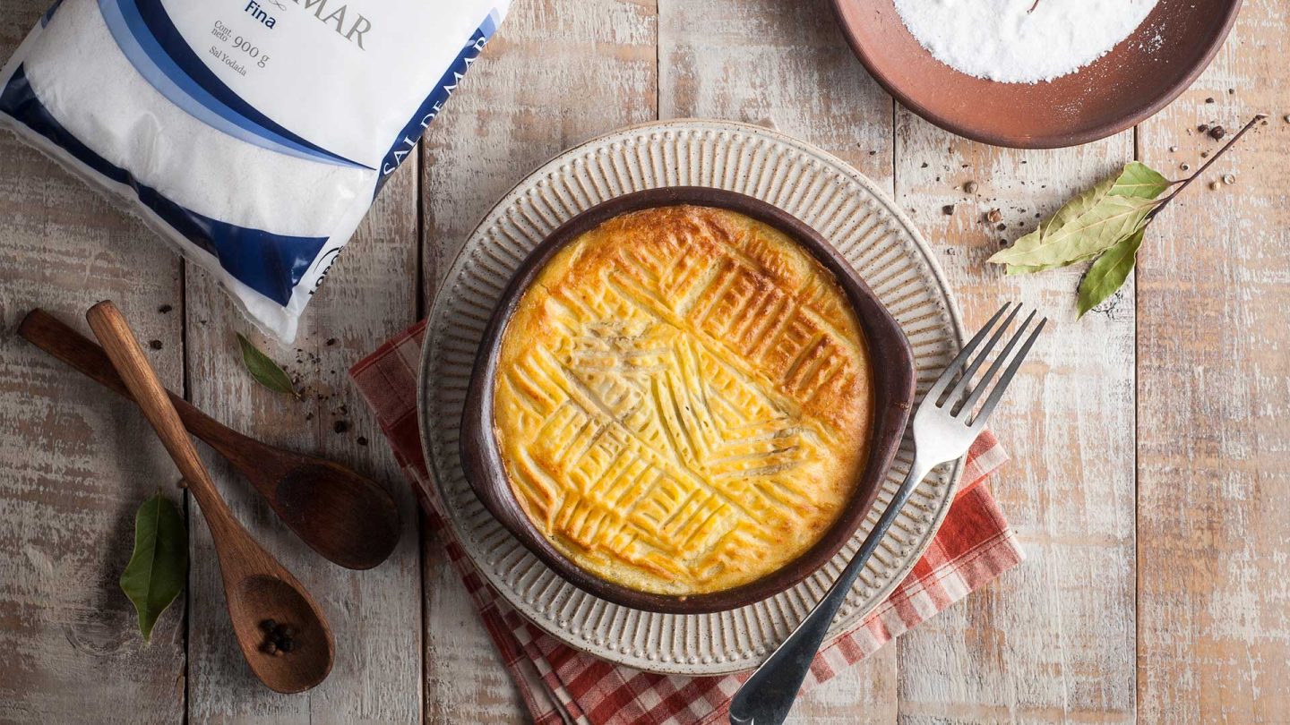 Luego, calentamos agua en una olla con un poco de Sal de Mar Lobos y ponemos las papas hasta que hiervan y se ablanden, cuando estén listas se escurren, se muelen y se mezclan con leche caliente, mantequilla derretida, pimienta y nuez moscada, mezclamos bien y rectificamos el sabor. La textura debe quedar suave y homogénea, cuando la tengamos lista la ponemos sobre el pino y aplanamos.